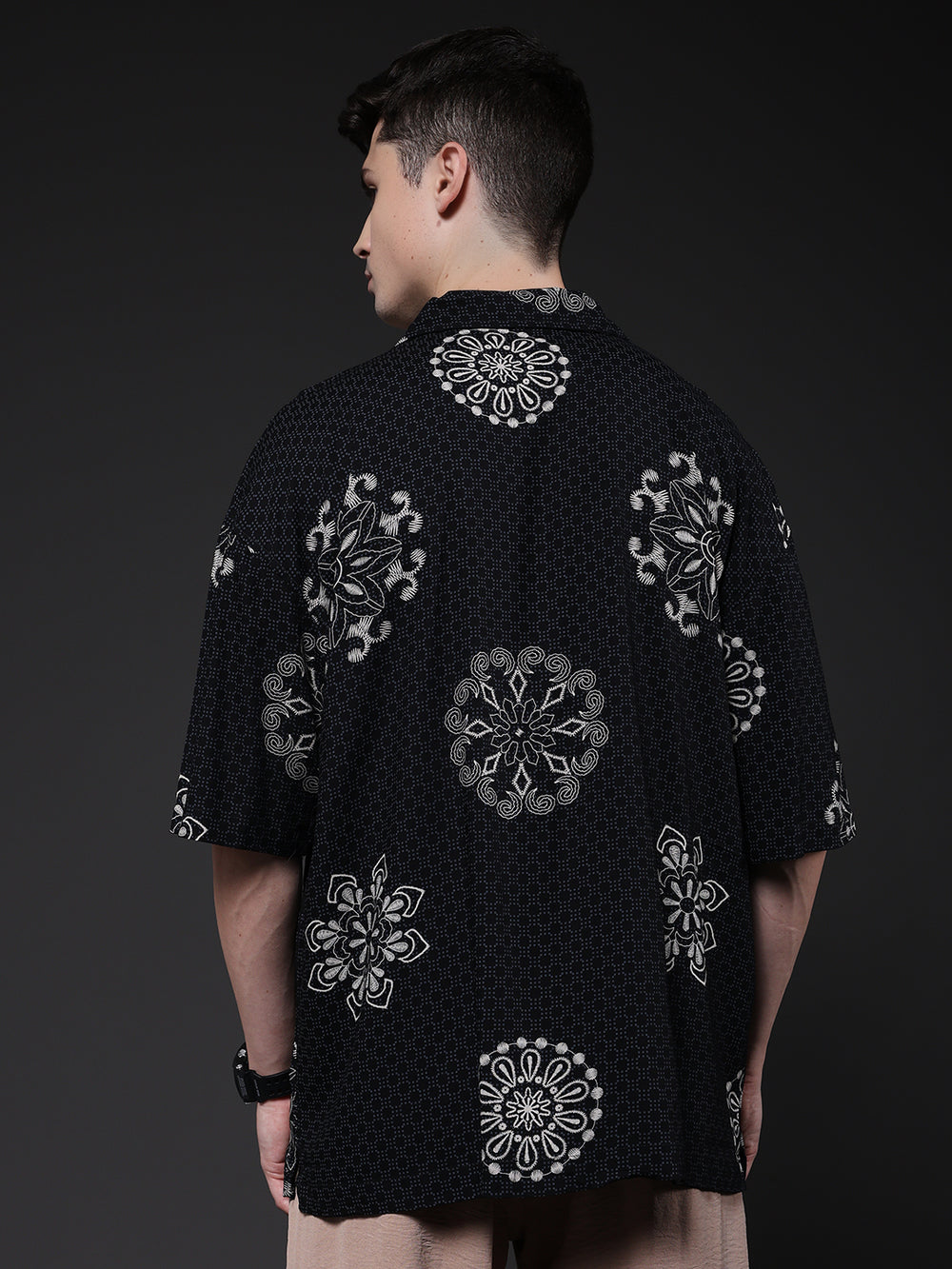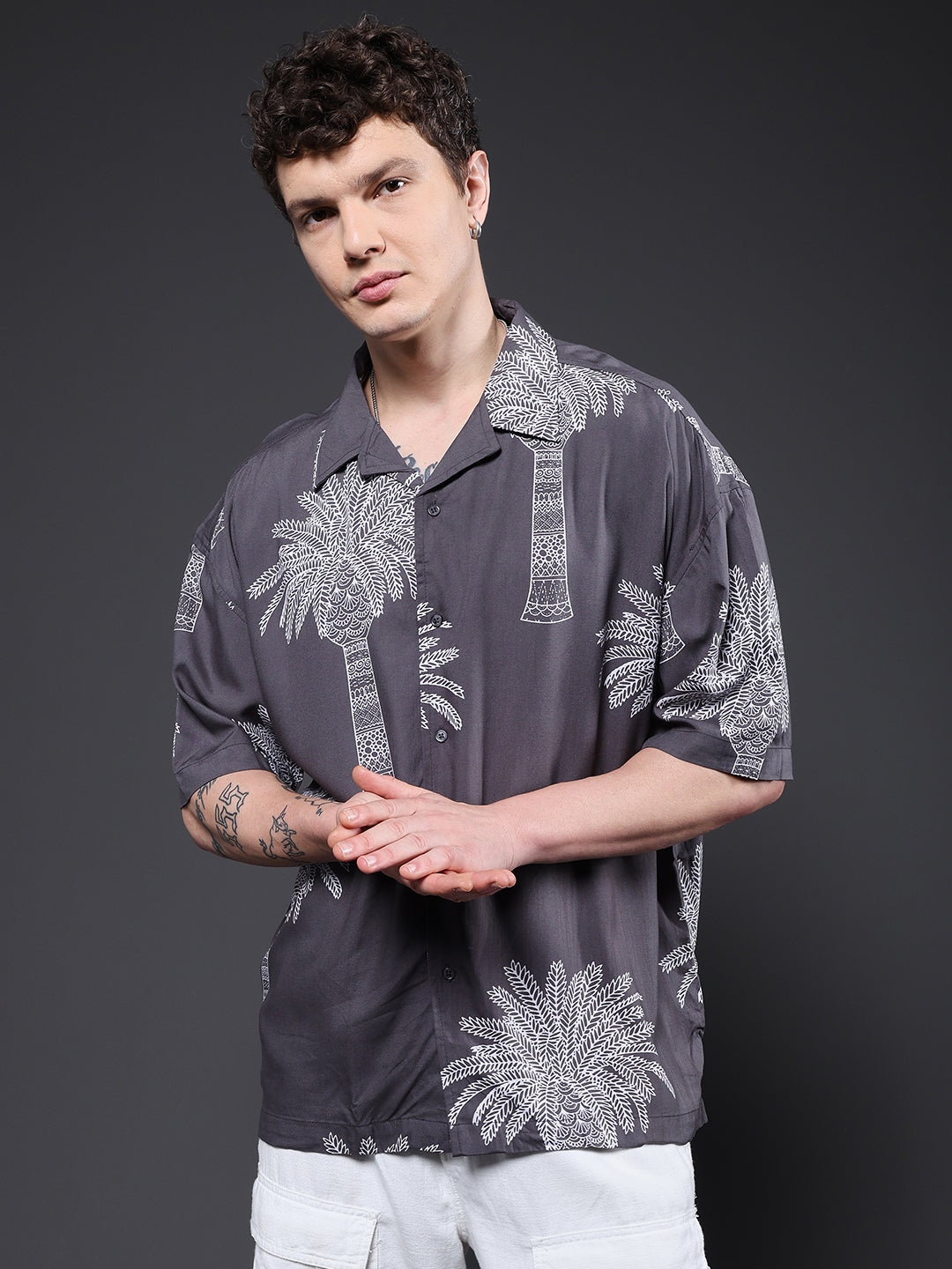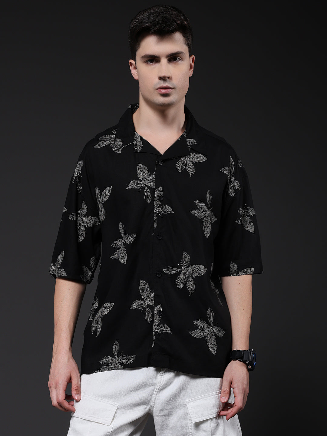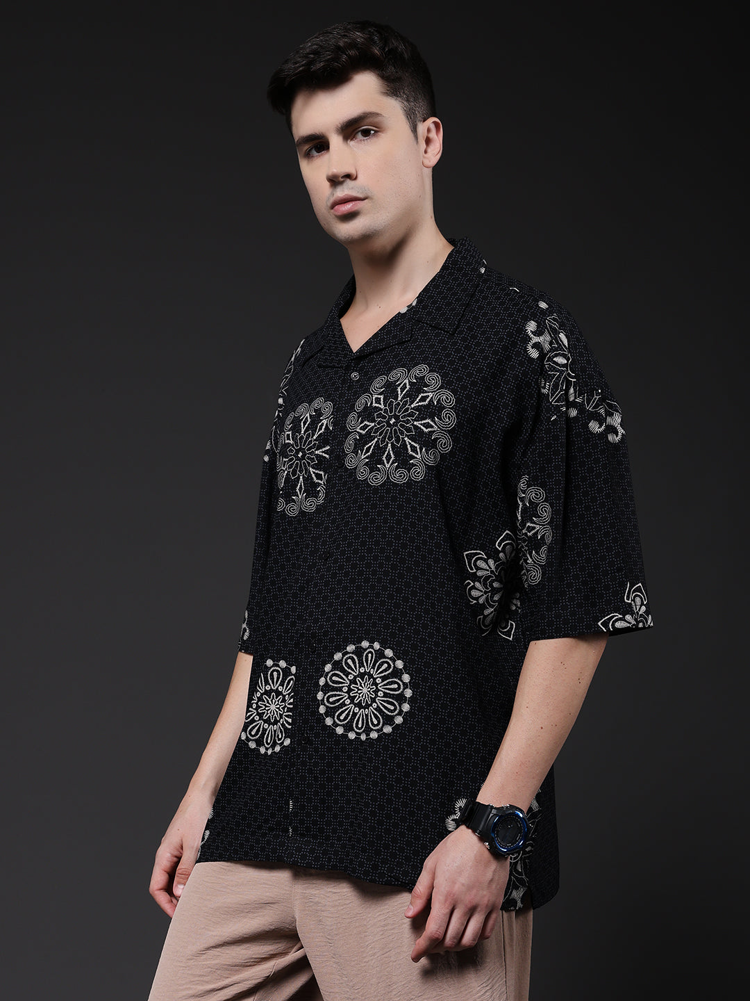 Mens Cuban Collar Printed Casual Shirt