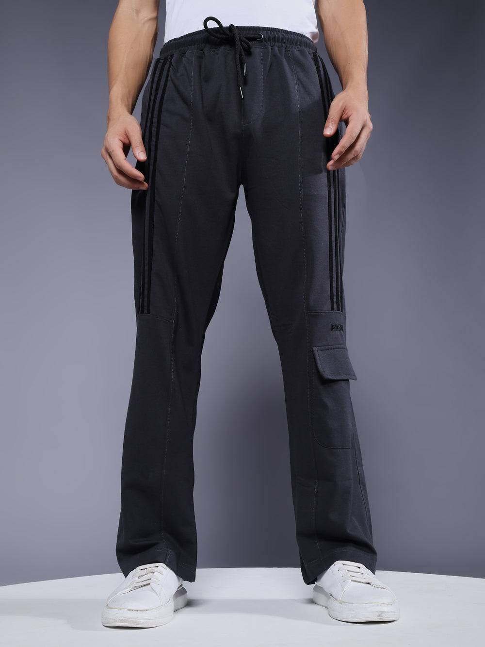 Men Premium Terry Cargo Pants with Side Stripes - Dark Grey