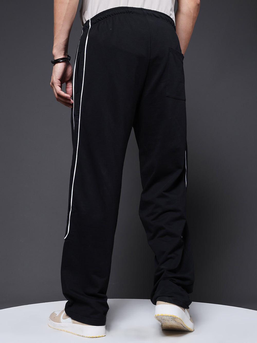 Men's relaxed-fit black jogger featuring contrast side stripes and an adjustable drawstring waist for everyday comfort and style.