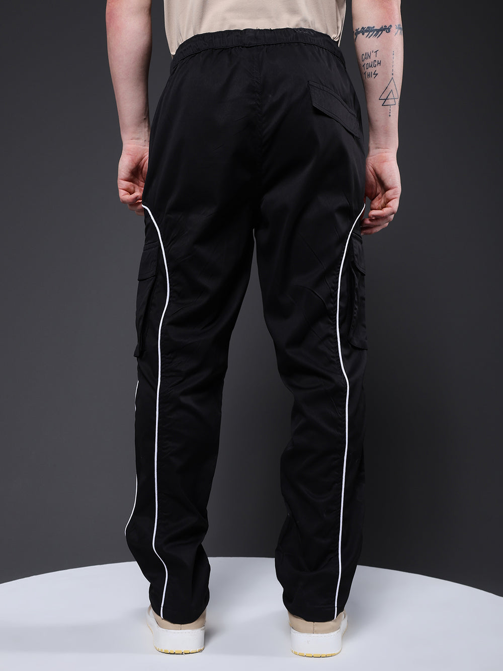 Men's relaxed-fit black cargo joggers featuring contrast side stripes, multiple pockets and an adjustable drawstring waist for everyday comfort and style.