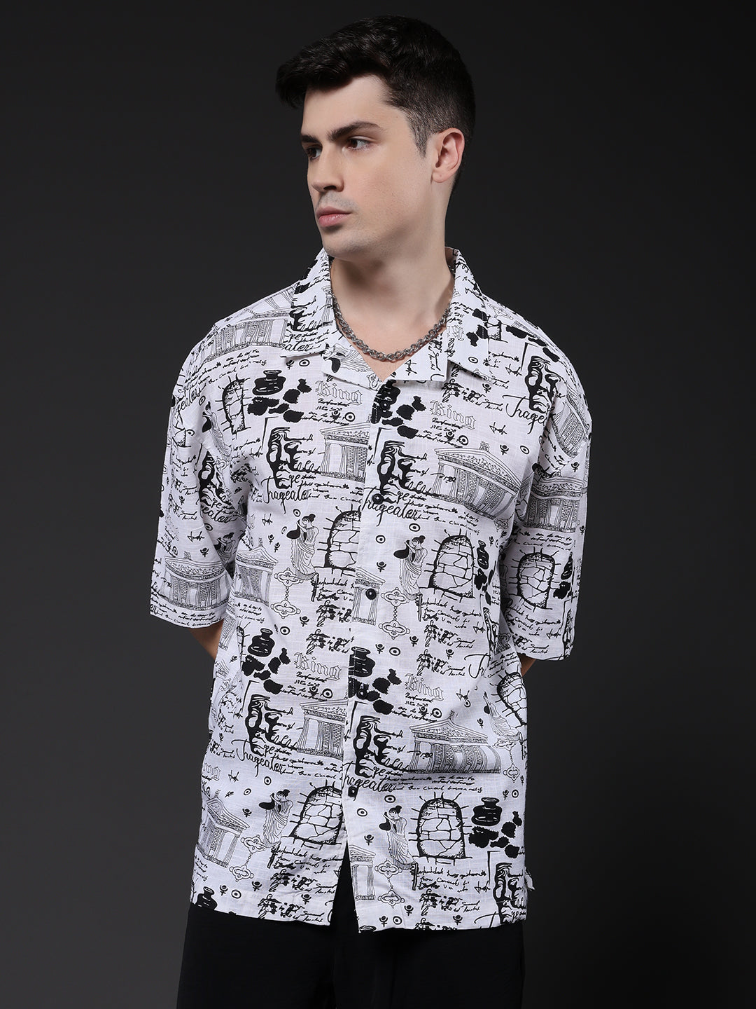 Stay cool and stylish with white half sleeve shirt for men featuring relaxed fit and bold abstract design. Made from soft rayon fabric. it is perfect for casual wear or summer outings.
